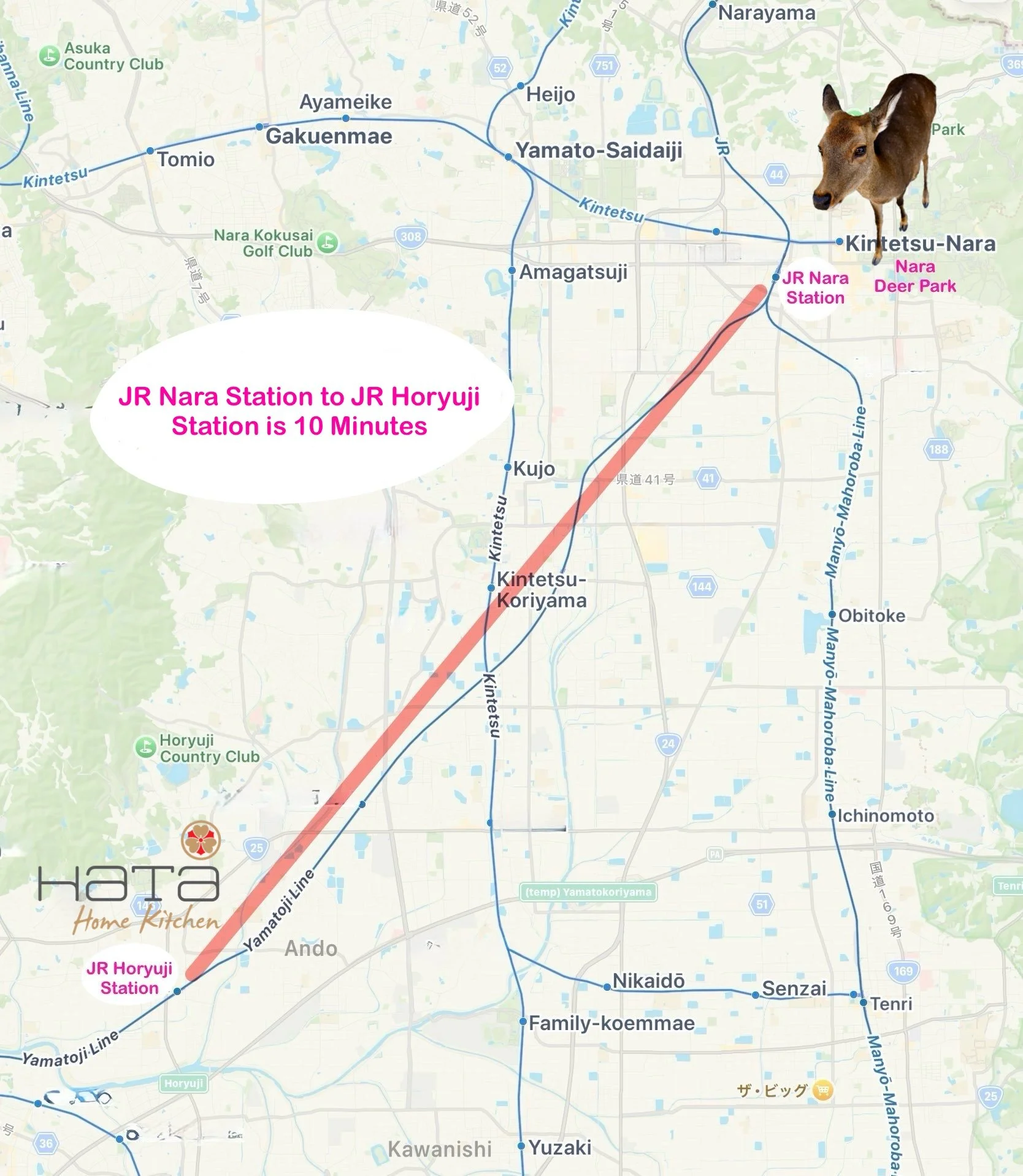 Hop on the train for a ten-minute ride from JR Nara Station to JR Horyuji Station. Then walk through the historic, UNESCO World Heritage Horyuji Temple to our home!